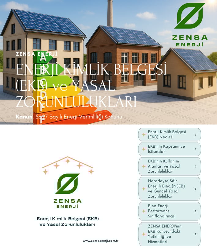 Enerji Kimlik Belgesi (EKB) ve Yasal Zorunlulukları & EKB'nin Kapsamı ve İstisnalar & Neredeyse Sıfır Enerjili Bina (NSEB) ve Güncel Yasal Zorunluluklar & NSEB'in Avantajları ve ZENSA ENERJİ'nin NSEB Çözümleri & Bina Enerji Performansı Hesaplama Yöntemi (BEP-HY) & Bina Enerji Performans Sınıflandırması & Bina Enerji Performansı Yazılımı (BEP-TR) & ZENSA ENERJİ'nin EKB Konusundaki Yetkinliği ve Hizmetleri
